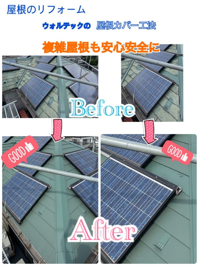 複雑屋根+ソーラーパネルもウォルテックなら予算内での工事が可能です! -