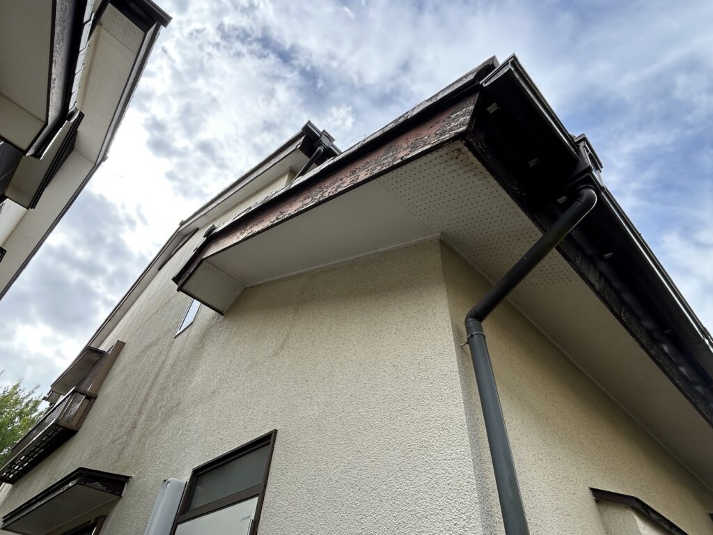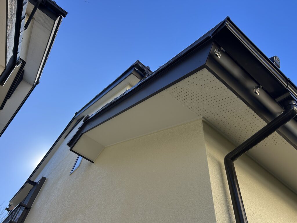 モルタル外壁の塗り替え、セメント瓦屋根の遮熱塗装、破風板の板金カバー、雨樋交換、軒天張り替えまで実施しました。