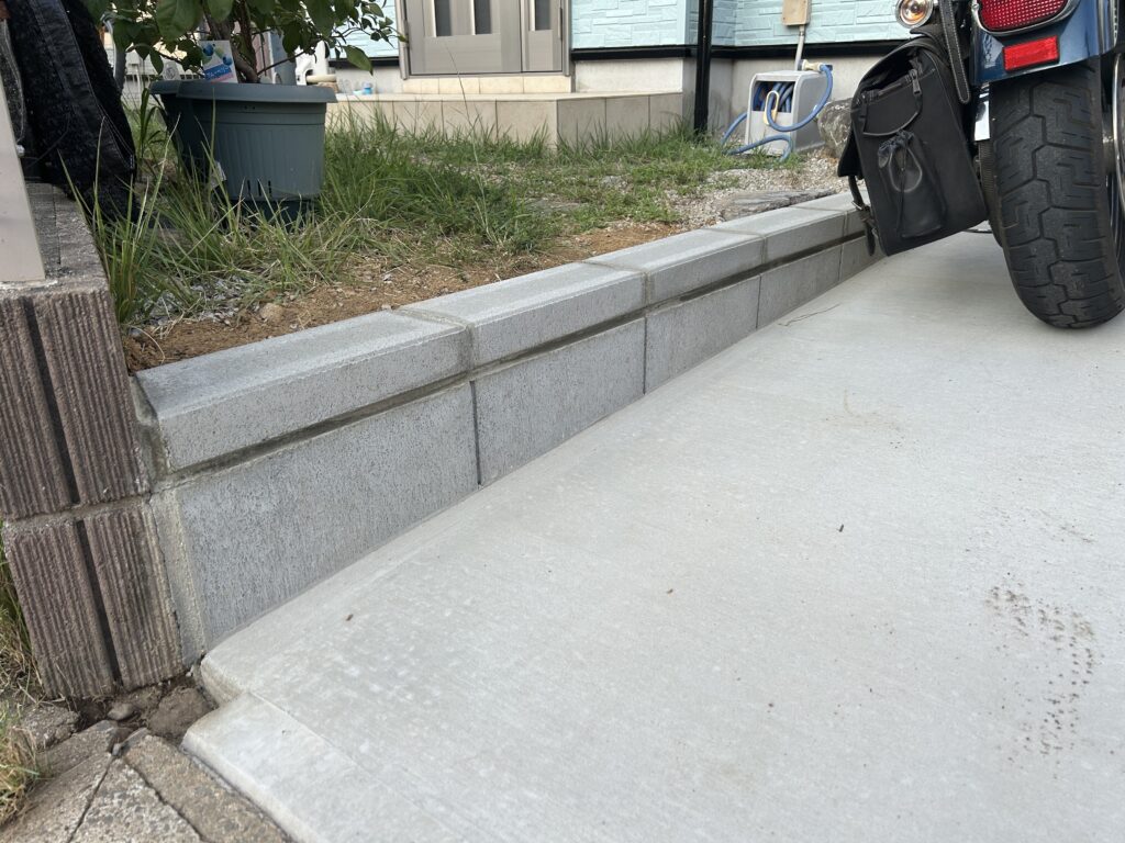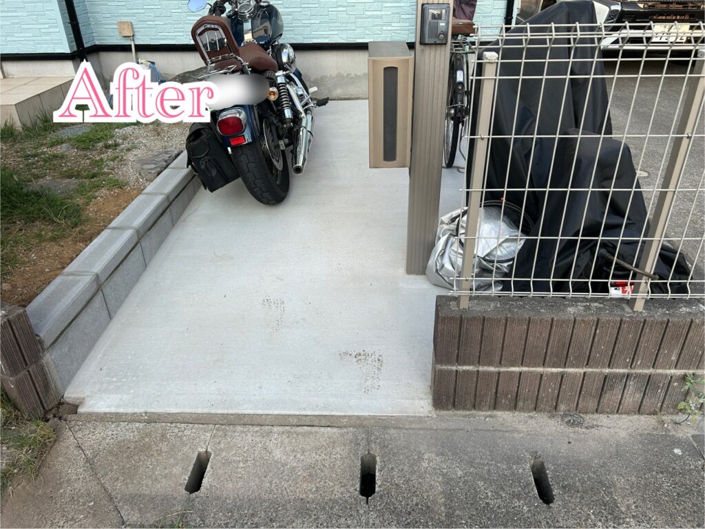 玄関前のブロックで囲われたデッドスペースを有効利用したいとのご相談で、段差をなくしてバイク置き場としてリフォームしました。施工後は雨水による土の流れを防ぐため、ブロック面を少し高く仕上げることで、強度と見た目の両方を改善しました。