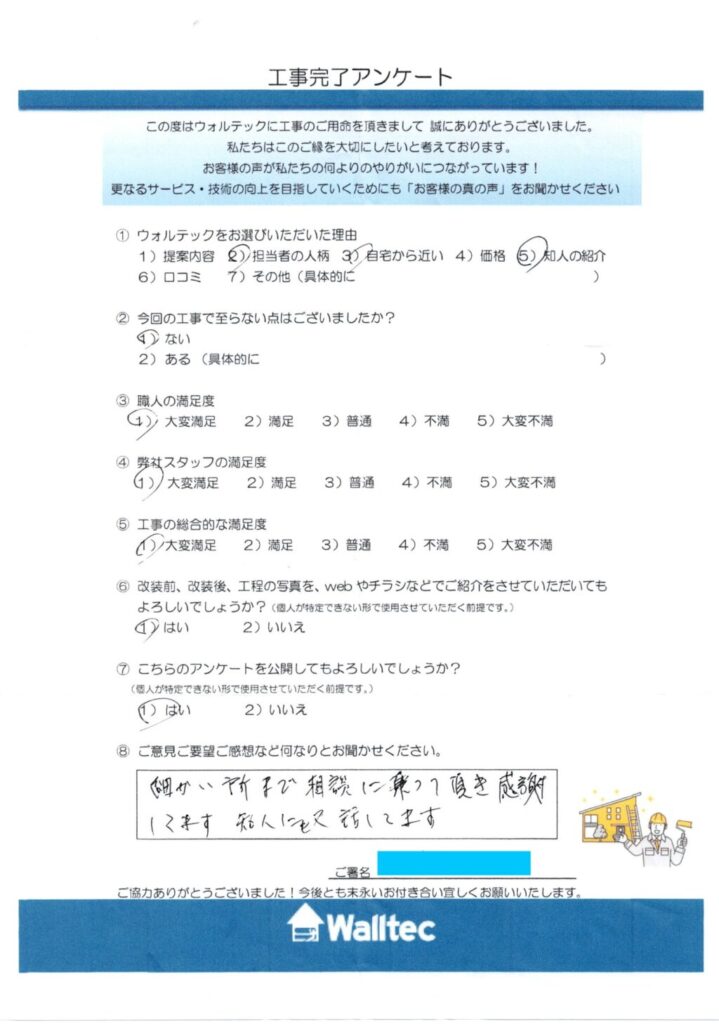 このたび、屋根・外壁工事をご依頼いただいたお客様より、工事完了後のアンケートにご協力をいただきました。
